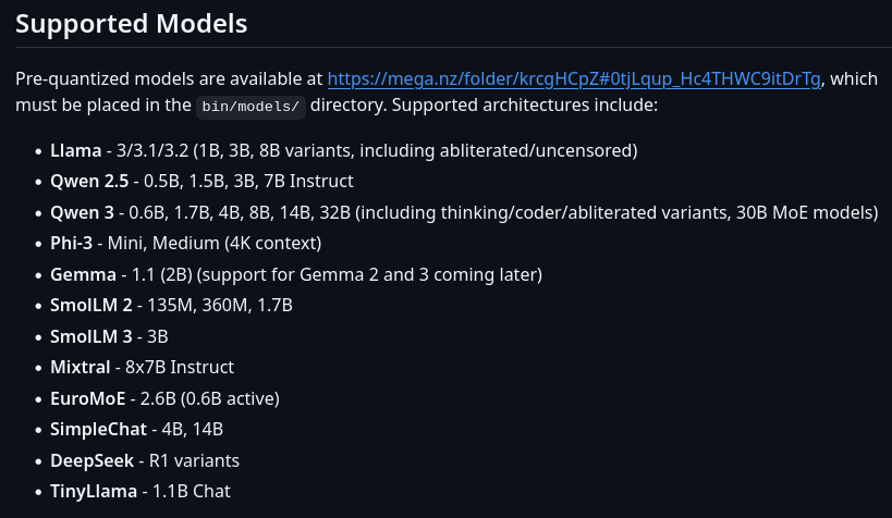 Pre-quantized models are available at https://mega.nz/folder/krcgHCpZ#0tjLqup_Hc4THWC9itDrTg, which must be placed in the bin/models/ directory. Supported architectures include: